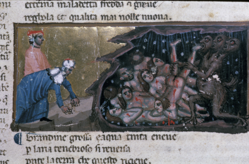 Here we have the punishment of gluttony from a manuscript of Dante’s Inferno. In classical mythology Cerberus was a three-headed dog who guarded the gates of Hades; here he is a three-headed devil who eats those who eat too much. Be warned.