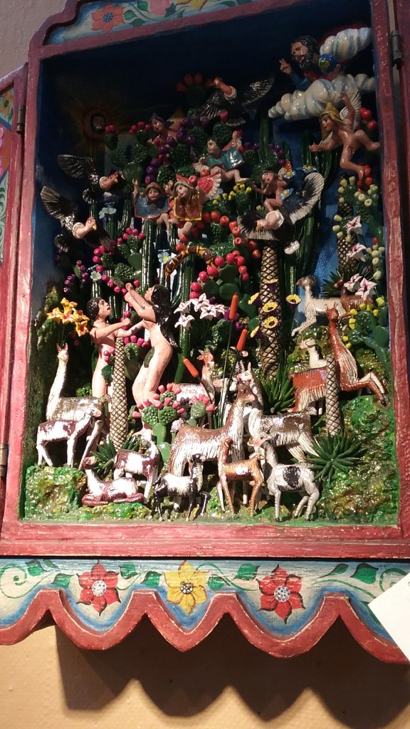 Retablos are sophisticated folk art in the form of portable boxes filled with brightly colored figurines arranged into intricate narrative scenes. From the 16th to the 19th centuries, Retablos were carried through the mountains by Spanish priests as portable religious shrines for Catholic saints. Later, they were adapted by indigenous people to include their own deities and mythologies.