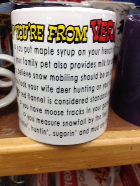 The gizmo department fades away in turn. Clothing appears. Yes, you can get a Dan & Whit’s sweatshirt, if you insist. You can also get a big, touristy mug that proclaims all the traits that identify Vermonters.